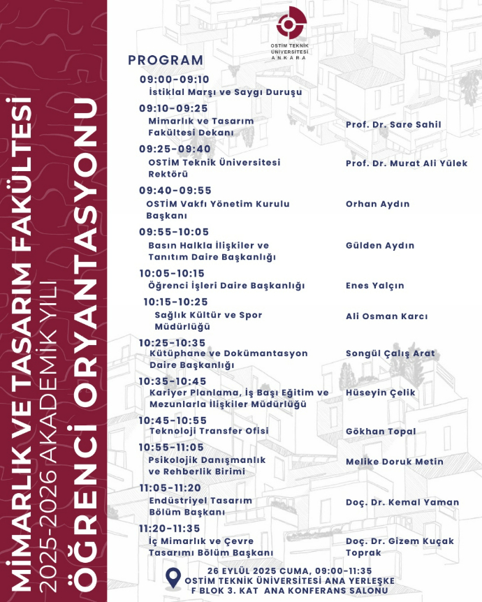 Üniversite hayatınıza keyifli bir başlangıç yapmanız, bizleri ve üniversitemizi daha yakından tanımanız için harika bir gün planladık. Bölümümüzün oryantasyon programı 26 Eylül 2025 Cuma günü yapılacaktır.